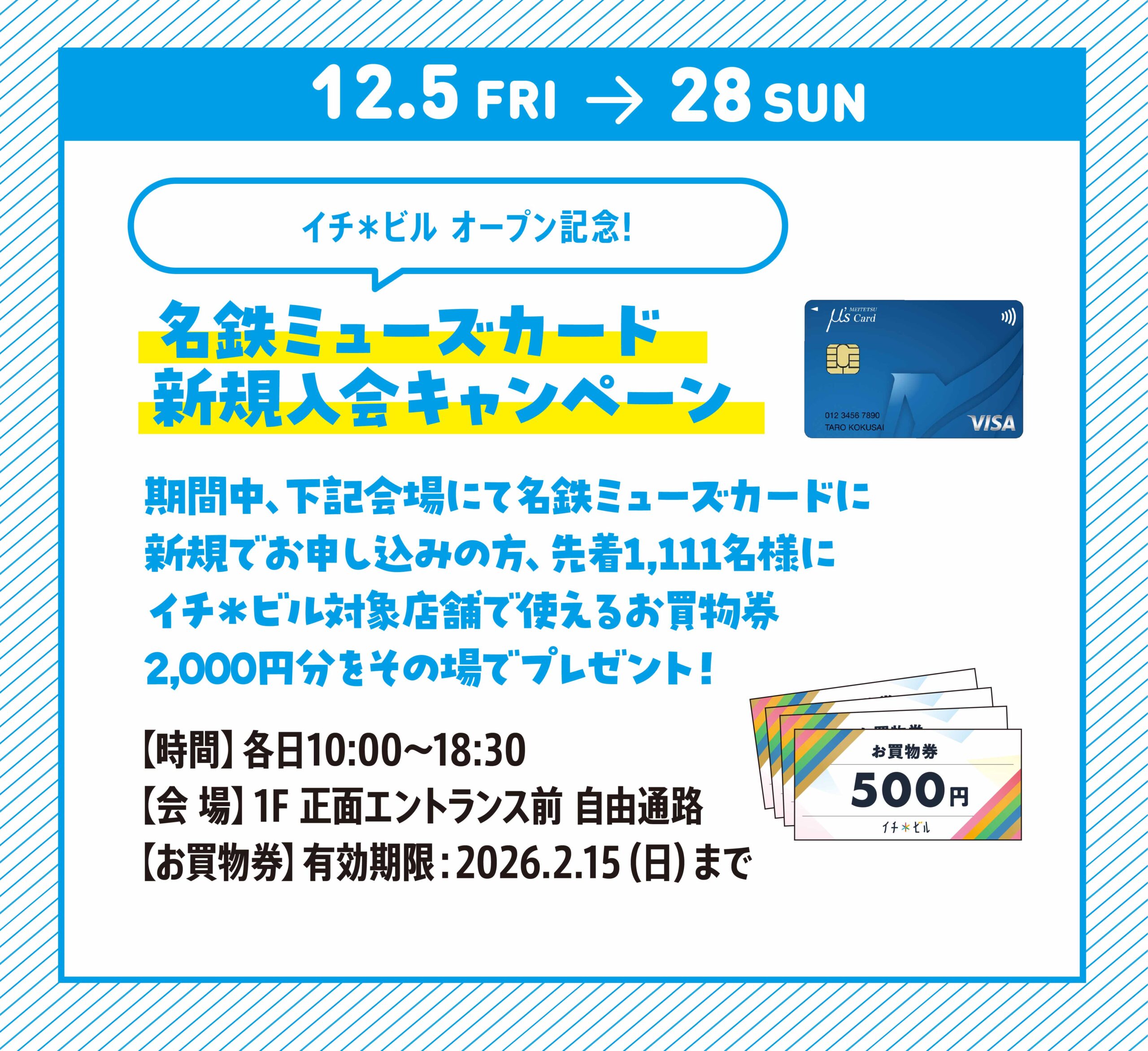 期間中、名鉄ミューズカードに新規でお申し込みの方先着1,111名様に、イチ*ビル対象店舗で使えるお買物券2,000円分をその場でプレゼント!