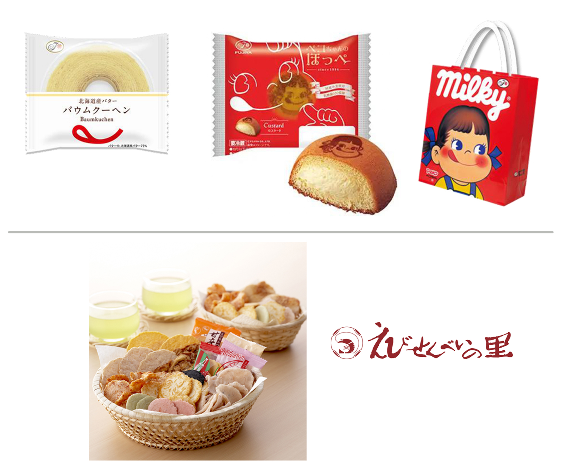 [不二家]バウムクーヘン、ペコちゃんのほっぺ、シュークリームなど
